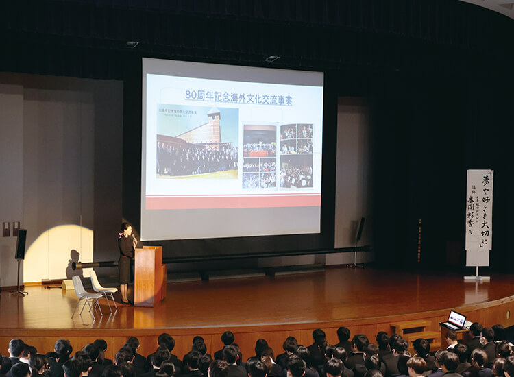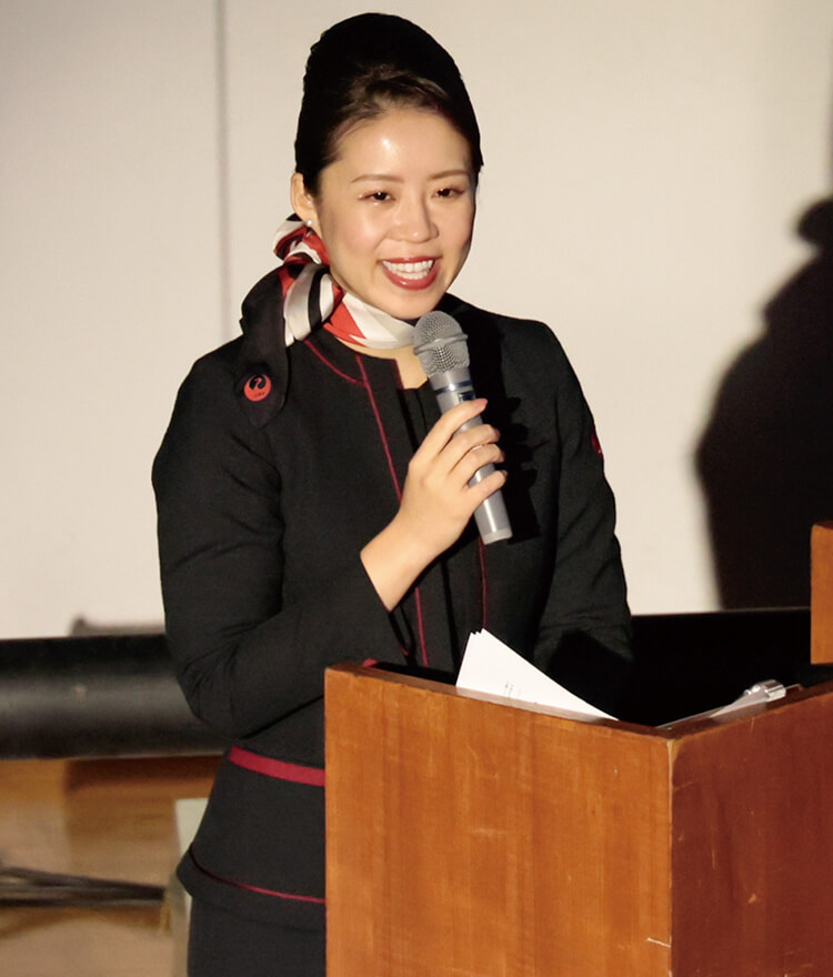 そう語る本間彩⾹さんは、⽇⼤三中・三⾼での学校⽣活や⼤学時代の経験を通して、⾃分の「好き」を⼀つずつ積み重ねてきました。年頭講演会では、客室乗務員として働く今に⾄るまでの道のりについてお話しくださいました。