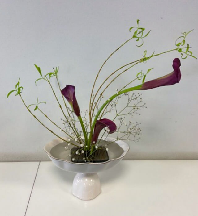 今回は前回の枝ものに、合う花材を部員がお花を選び買ってきてくれました。