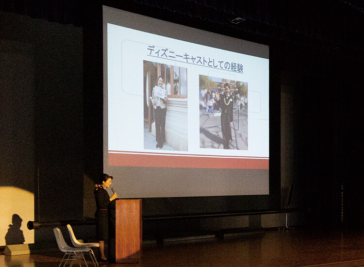 私は⼩さい頃からディズニーが好きで、将来の夢はディズニーのキャストになることでした。中学3年時には、ディズニーアカデミーという職業体験イベントに参加して、その⽬標はより強くなりました。⼤学⽣になって、その夢が叶いました。キャストの仕事を通して、おもてなしとは、思いやりを持ってゲストに接し、⼼から喜んでいただくことだと学びました。そして、さらにおもてなしを極めたい、という新しい夢ができました。