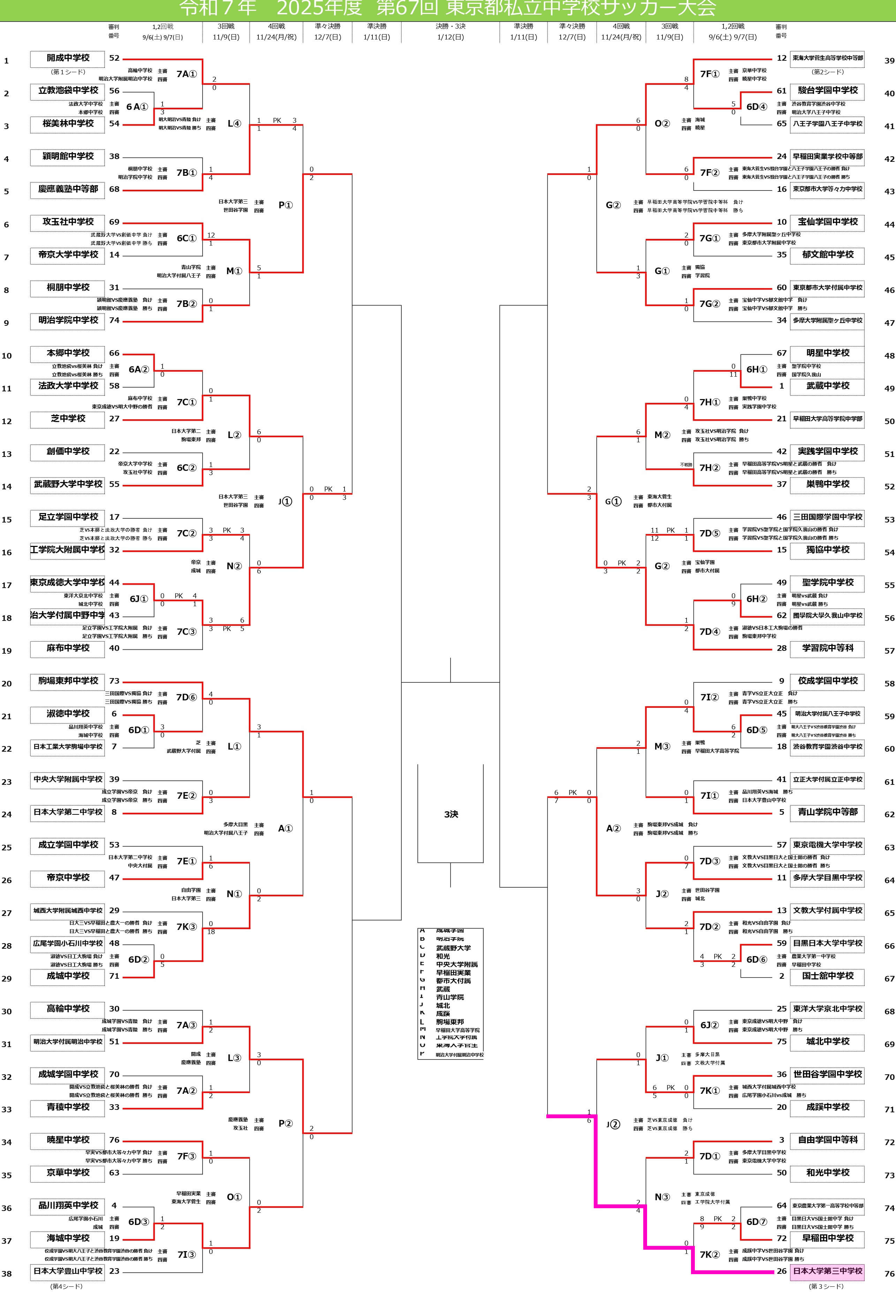 9月6日(土)~1月12日(月・祝)で開催中の【第67回 東京都私立中学校サッカー大会】において、首都圏大会決定戦で世田谷学園中学校に6-1で勝ち、3年連続で12月中旬から開催される私立中学校の関東大会、首都圏私立中学校チャンピオンズカップへの出場が決まりました。この大会は株式会社テレビ埼玉(テレ玉)が主催する大会です。東京都、神奈川県、千葉県、埼玉県から16チームが出場し、埼玉スタジアム2002第2、3グラウンド(天然芝)、第4グラウンド(人工芝)を中心に開催されます。