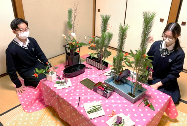 部活開きでは1月10日の学校説明会に向けて茶道・華道部員で生け花をしました。