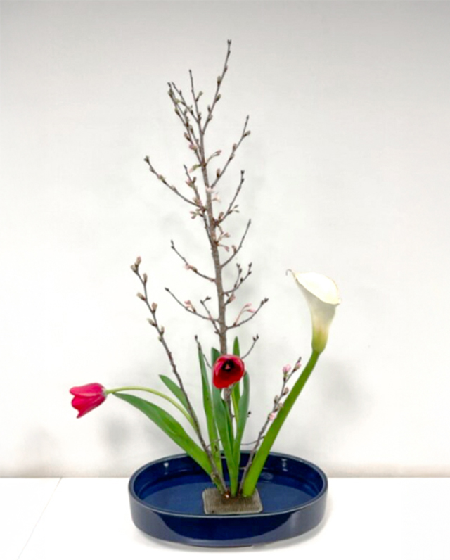 啓翁桜とチューリップを使って、春を先取りしてみました。