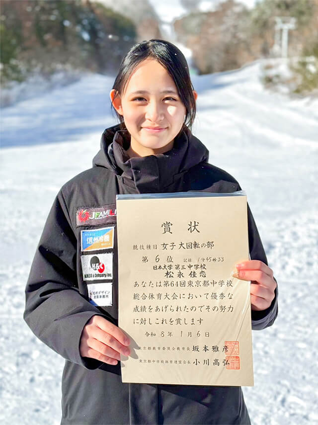 全国中学校スキー大会(アルペン)東京都予選会では、中学2年生の松永佳恋さんが回転で6位入賞、大回転でも6位入賞を果たし、大回転種目で全国中学校スキー大会への出場を決めました。