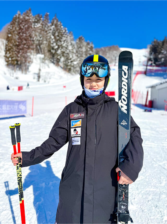 全国大会は、2月3日から6日まで長野県・野沢温泉スキー場で開催されました。4日に行われた大回転競技は、澄み渡る青空のもとでレースが行われました。結果は転倒による途中棄権となりましたが、積極的な滑りを見せ、今後につながるレースとなりました。